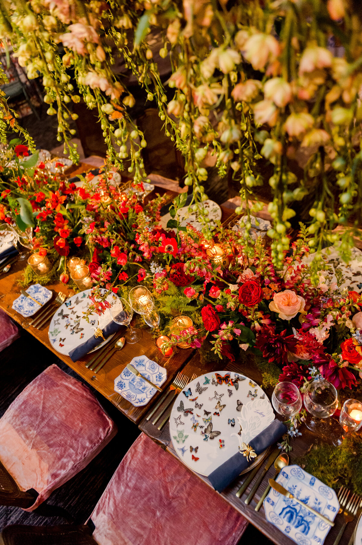 Who says a lower level ballroom can't be completely transformed? We took this summer wedding pattern play to the next level and intertwined patterns, foliage and butterfly covered everything.